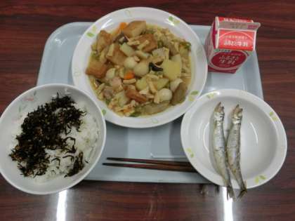 メニューは牛乳、ごはん、ひじきのふりかけ、鶏とじゃが芋のうま煮、焼きシシャモでした。和食はミネラル・食物繊維が豊富ですね。特に本日はシシャモ、うま煮に凍り豆腐が入りカルシウムが一段と多くなっています。