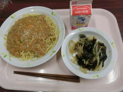 メニューは、肉みそ麺、もやしとわかめの胡麻ドレッシング、牛乳です。のど越しの良い麺類は生徒たちも大好きです。