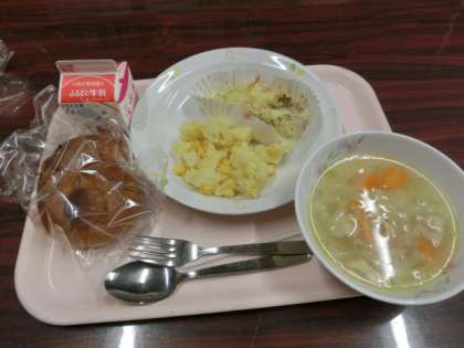 メニューは白身魚のマヨネーズ焼き、コーンポテト、黒糖パン、野菜スープ、牛乳です。