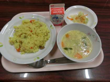 メニューはパエリア風ピラフ、卵と青菜のスープ、キャベツサラダ、牛乳です。