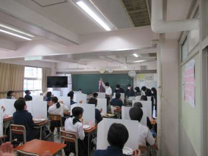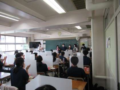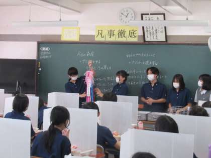 修学旅行で広島に届ける千羽鶴。全校生徒で作った折り鶴が千羽鶴となって駒留中の思いが1つになりました。今日の給食の時間に、修学旅行実行委員が1・2年生の教室を回り、千羽鶴をお披露目しました。1・2年生は自分たちが手掛けた千羽鶴を見て歓声を上げ、「いってらっしゃい」の思いを込めて拍手を送りました。
