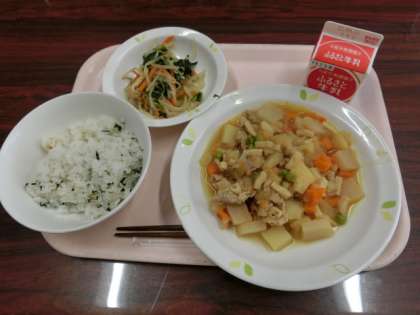 メニューはわかめご飯、肉じゃがうま煮、おひたし、牛乳です。肉じゃがには、高野豆腐も入りカルシウム満点です。