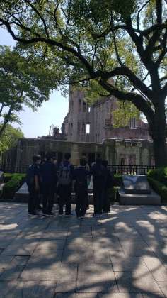 広島に到着しました。原爆ドーム前で、地元ガイドの方について、平和学習を始めました。