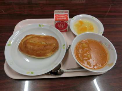 メニューは牛乳、ガーリックトースト、ハンガリアンシチュー、フルーツポンチです。