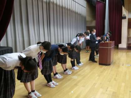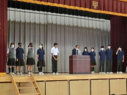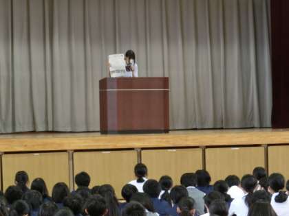 校長先生のお話の後、先日行われた陸上大会の表彰がありました。また、生徒会からのボランティアの募集、安全指導、生活指導主任のお話がありました。