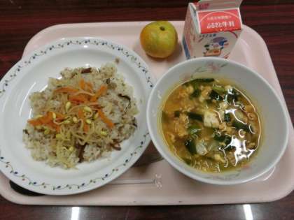 メニューは牛乳、ビビンバ、キムチスープ、ミカンです。キムチは発酵食品の一つで、乳酸菌が豊富で腸内環境を整えるのに大切な食品です。
