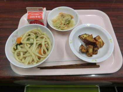 寒い日になりました。あたたかいうどんがうれしいですね。サツマイモはビタミンCや食物繊維がとれるので残さず食べましょう。