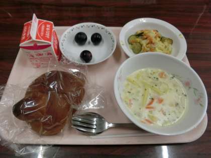 メニューは牛乳、ココアパン、マカロニのクリーム煮、ポテト入りフレンチサラダ、巨砲です。ブドウは秋の味覚の代表の一つです。果物には消化酵素が含まれているので適切に取りたい食物の一つです。