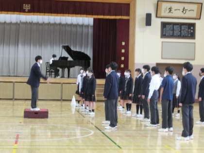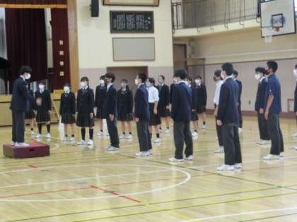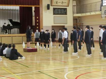 本日は、体育館で出入りの練習と課題曲を歌いました。26日のパーシモンホールでの本番に向け練習を重ねていきます。