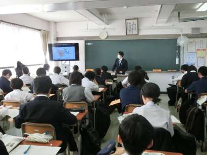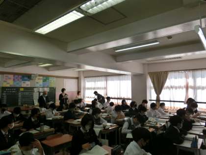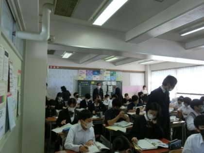 1時間目に1年1組で社会科の研究授業を行いました。先生方が後ろに並ばれているせいか生徒達も少し緊張気味でした。