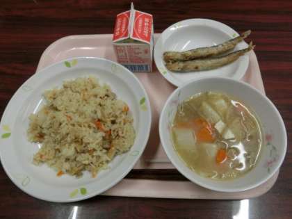 メニューは牛乳、高野めし、さつま汁、シシャモのから揚げです。本日の給食の食品目数は18種類です。1日30品目以上の摂取が理想なので、夕食の食品数を多くするようにすると良いですね。