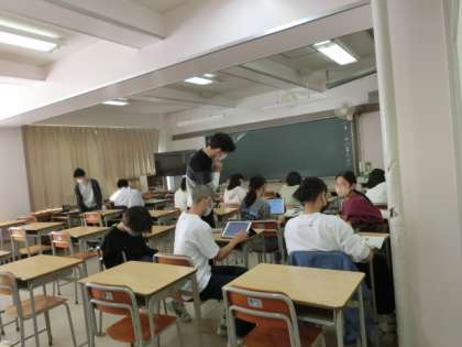 中学校にふさわしい服装ができていますね。本日は3時間授業ですが、皆期末テストを意識して真剣に取り組んでいます。