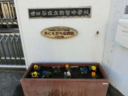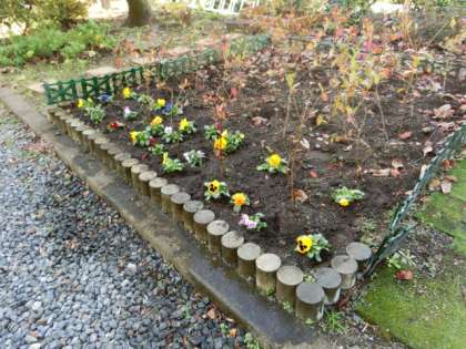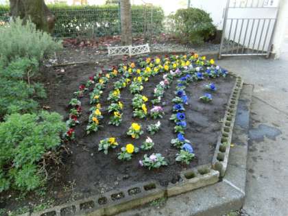 学校の美化で、校門横、花壇にパンジーを植えこみました。生徒の発案で花壇は虹をイメージしています。