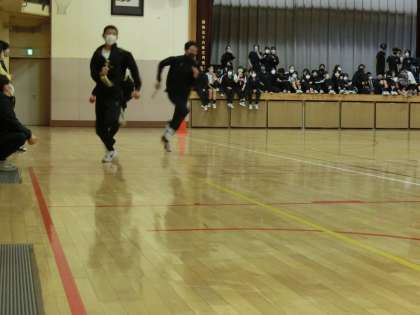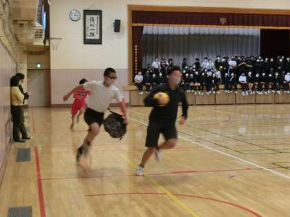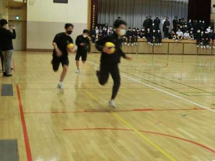 12月13日(火)5・6時間目に実施した学年レクでは、最後に「部活動対抗リレー」を行いました。部活動ごとに6人1チームをつくり、卓球部であればラケット、吹奏楽部はマラカス、バスケットボール部はボールのように、それぞれのアイテムをバトンにしました。部活動に所属していない人はメンバーが足りないところに入ったり、帰宅部というチームでリュックをバトン代わりにリレーに参加したりしました。日頃の団結力の高さを見ることができました。