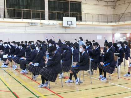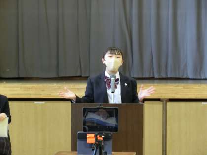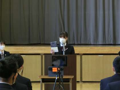 本日2年生でビブリオバトルを開催しました。各クラスから勝ち上がった7名の出場者が緊張感のある中で気持ちのこもった発表をしてくれました。どの本も手に取って読みたくなる本ばかりです。クラスのビブリオバトルや学年決勝戦の中で読みたい本があった人はぜひ読んでみてください。