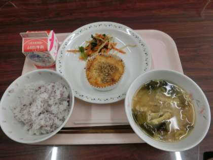 メニューは牛乳、ゆかりご飯、松風焼き、おひたし、じゃが芋の味噌汁です。
