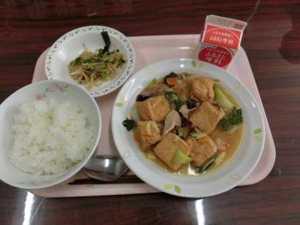 メニューは牛乳、ごはん、生揚げの中華煮、もやしとにらのごま風味です。3学期が始まり3日目です。体調管理に気を付けましょう。