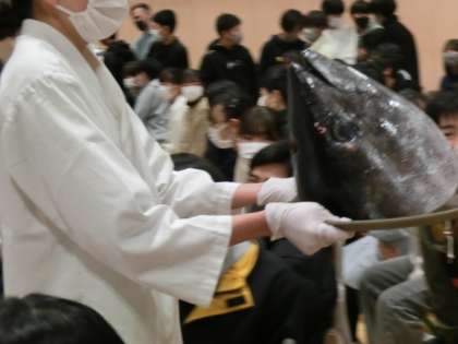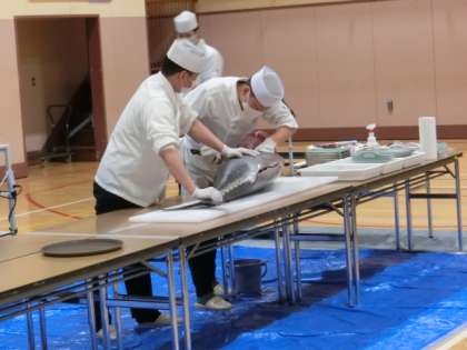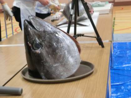 最初に頭を落とします。ま近に見ることができるようにお盆に載せてまわってくださいました。