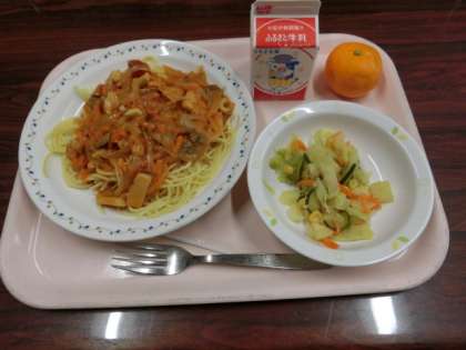 メニューは牛乳、ミカン、スパゲティ地中海ソース、ポテト入りフレンチサラダです。