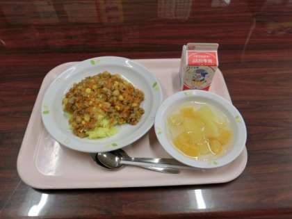 メニューは牛乳、ひよこ豆カレー、フルーツポンチです。ご飯はターメリックできれいな黄色で食欲が増しました。