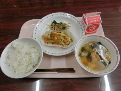 メニューは牛乳、ごま入りご飯、鮭のチャンチャン焼き、からし和え、みそ汁です。味噌はヨーグルトやキムチと同じ発酵食品の一つで、腸内細菌環境を整える働きがあります。