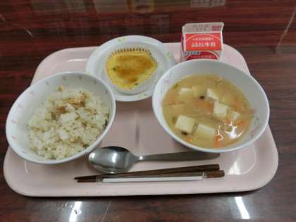 メニューは牛乳、子ぎつねご飯、中華風卵焼き、田舎汁です。中華風卵焼きにはえび、鶏肉、ロースハム等が入り栄養満点です。