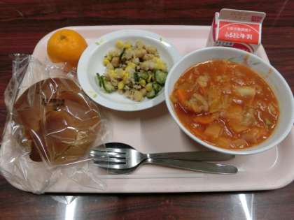 メニューは牛乳、黒糖パン、ボルシチ、ビーンズサラダ、ポンカンです。