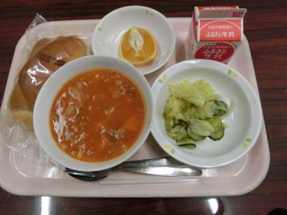 メニューは牛乳、ダイスチーズパン、オニオンサラダ、ハンガリアンシチュー、伊予かんです。ハンガリアンシチューはピーマン等が入り栄養満点です。伊予かんもビタミンCや酵素摂取に重要な食品です。残さず食べましょう。