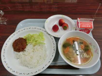 メニューは牛乳、味噌カツ丼、のっぺい汁、イチゴです。味噌カツ丼は都立の入試の応援で「カツ」を「受検に勝つ」にかけています。3年生応援給食です。
