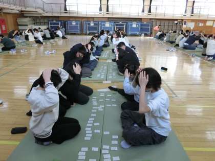 本日、2学年で百人一首大会を行いました。授業中に取り組んだ成果を生かして、一枚一枚に全力で取り組んでいました。2回戦行い、勝利チームの数が最も多かった2年2組が優勝という結果になりました。また来年も取り組む予定ですので、3学年では新しいクラスのメンバーと切磋琢磨して取り組んでくれることを期待しています。