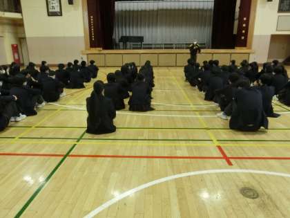 まず、先週に3日間行われました学び舎合唱交流について、無事3日間終えることができたことや、学び舎実行委員会のメンバーが中心となって練習をしっかりできたことなどについてお話がありました。続いて、本日から卒業式に向けての練習が始まること、卒業式の主役である3年生が輝けるよう、1・2年生や周りの方々が支えてくださっていることなどのお話があり、これからの練習に向けての説明がありました。