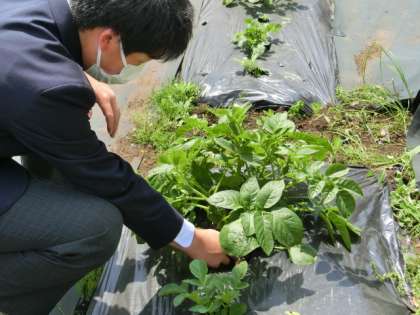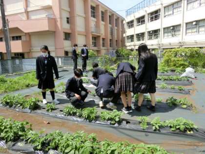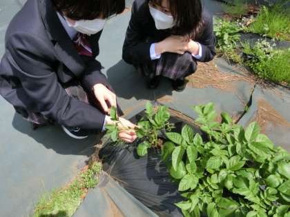 3年生はじゃが芋を栽培しています。男爵イモやメークイン、きたあかり等、沢山の種類から自分が栽培したい種類を植えました。今日は脇芽の芽カキを行いました。