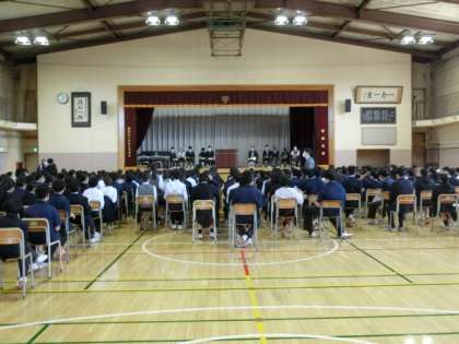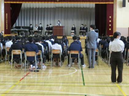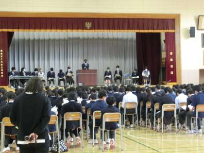 5月2日6時間目に生徒総会が行われました。新学期が始まってから1か月弱の忙しい中各委員会や学年、生徒会は活動方針案を決めクラス討議を経て本日を向かえました。皆立派な態度で発表しました。聞く態度も立派でした。
