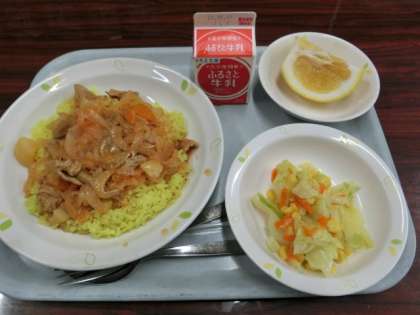 メニューは牛乳、ハッシュドライス、コーンサラダ、河内晩柑です。