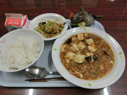 メニューは牛乳、麻婆豆腐、ナムル、麦入りごはんです。