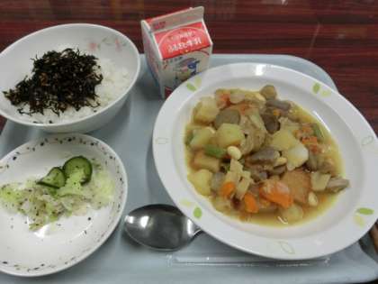 メニューは牛乳、ごはん、ひじきのふりかけ、豆入り筑前煮、ゆかり和えです。