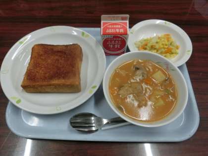 メニューは牛乳、コーンサラダ、ポークシチュー、シナモントーストです。来週のテストに向け学習で脳はフル回転です。脳には糖質が大切です。