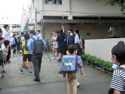 6月13日(火)の朝、生徒会役員と中丸小学校の児童会役員の皆さんが中丸小学校であいさつ運動を行いました。