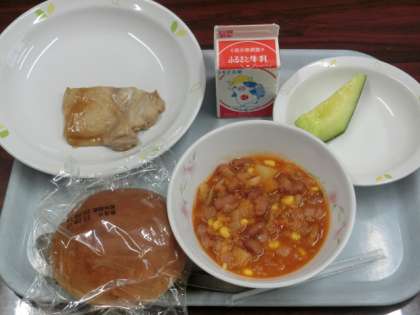 メニューは牛乳、照り焼きチキンサンド、チリコンカン、メロンです。