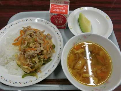 メニューは牛乳、チンジャオロース丼、カボチャの味噌汁、メロンです。