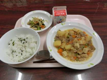 メニューは牛乳、わかめご飯、肉じゃがうま煮、おひたしです。