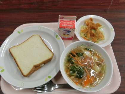 メニューは牛乳、ハムチーズサンド、ぱりぱりサラダ、春雨スープです。