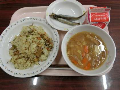 メニューは牛乳、さつま汁、焼きシシャモ2匹、豚肉と昆布のご飯です。