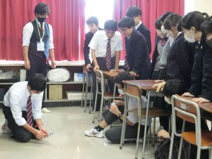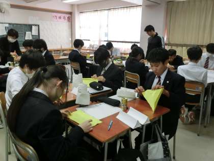 今日行った授業は、工学(折り紙)・商業・社会・美術・数学・理科。工学や商業は高校ならではの科目ですが、なじみの教科でも内容は高校の内容であり、難しいながらも先生方のわかりやすく楽しい授業を展開していただき、2年生はメモを取りながら興味深く、また楽しみながら授業を受けていました。これから進路希望先を選ぶときに、今日の授業のことを参考にしてほしいと思います。