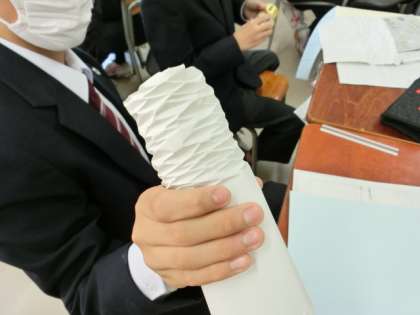 紙を缶に巻き付け均等に力を加えると、このようなひし形の形で折れるそうです。これをヨシムラ折り(パターン)と言うそうです。