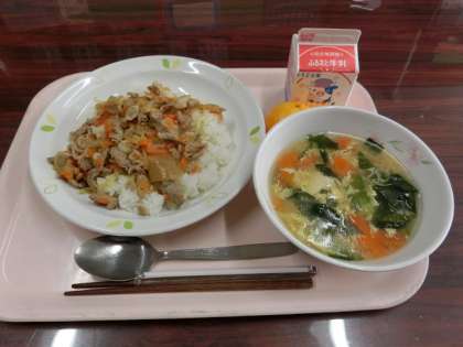メニューは牛乳、みかん、生姜焼き丼、かきたま汁です。