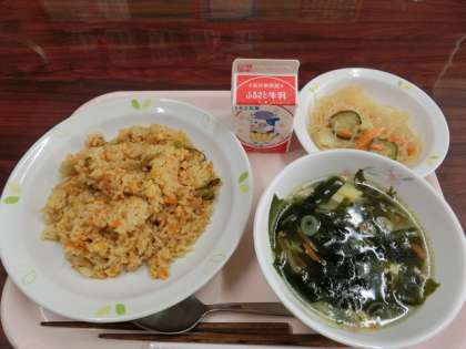 メニューは牛乳、キムチチャーハン、わかめスープ、春雨サラダです。