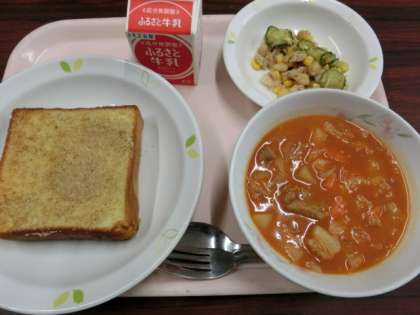 メニューは牛乳、セサミトースト、ビーンズサラダ、ボルシチです。