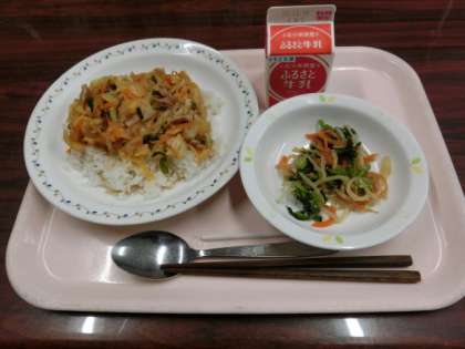 メニューは牛乳、キムチ丼、胡麻あえです。キムチ丼は大人気メニューの一つです。