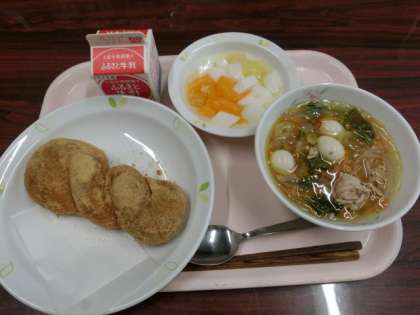 メニューは牛乳、春雨スープ、揚げパン、フルーツポンチです。